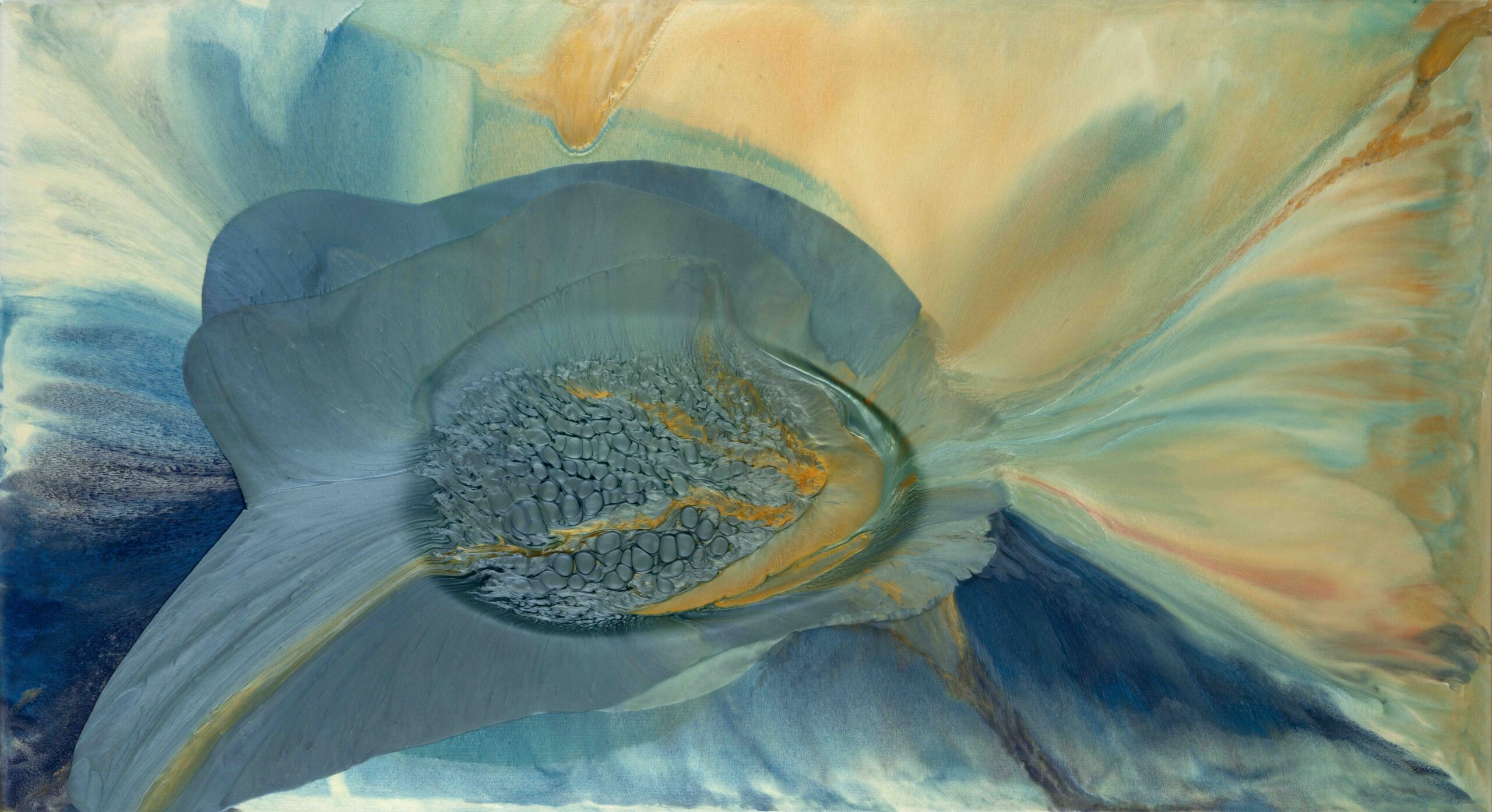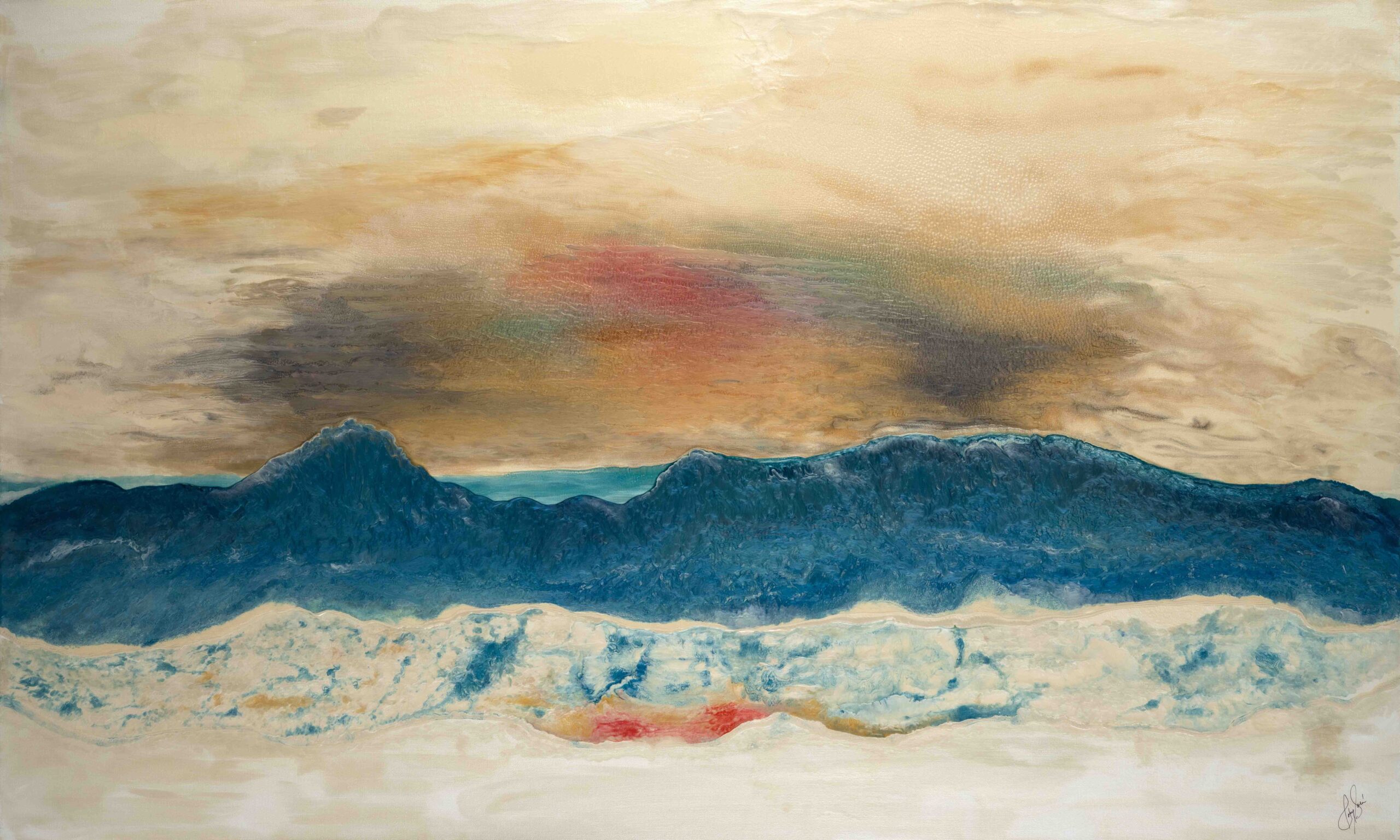 Acrylic/oil/resin pouring. 36"x60". Here you can see the beauty of a rising sun while evening is still in the air.