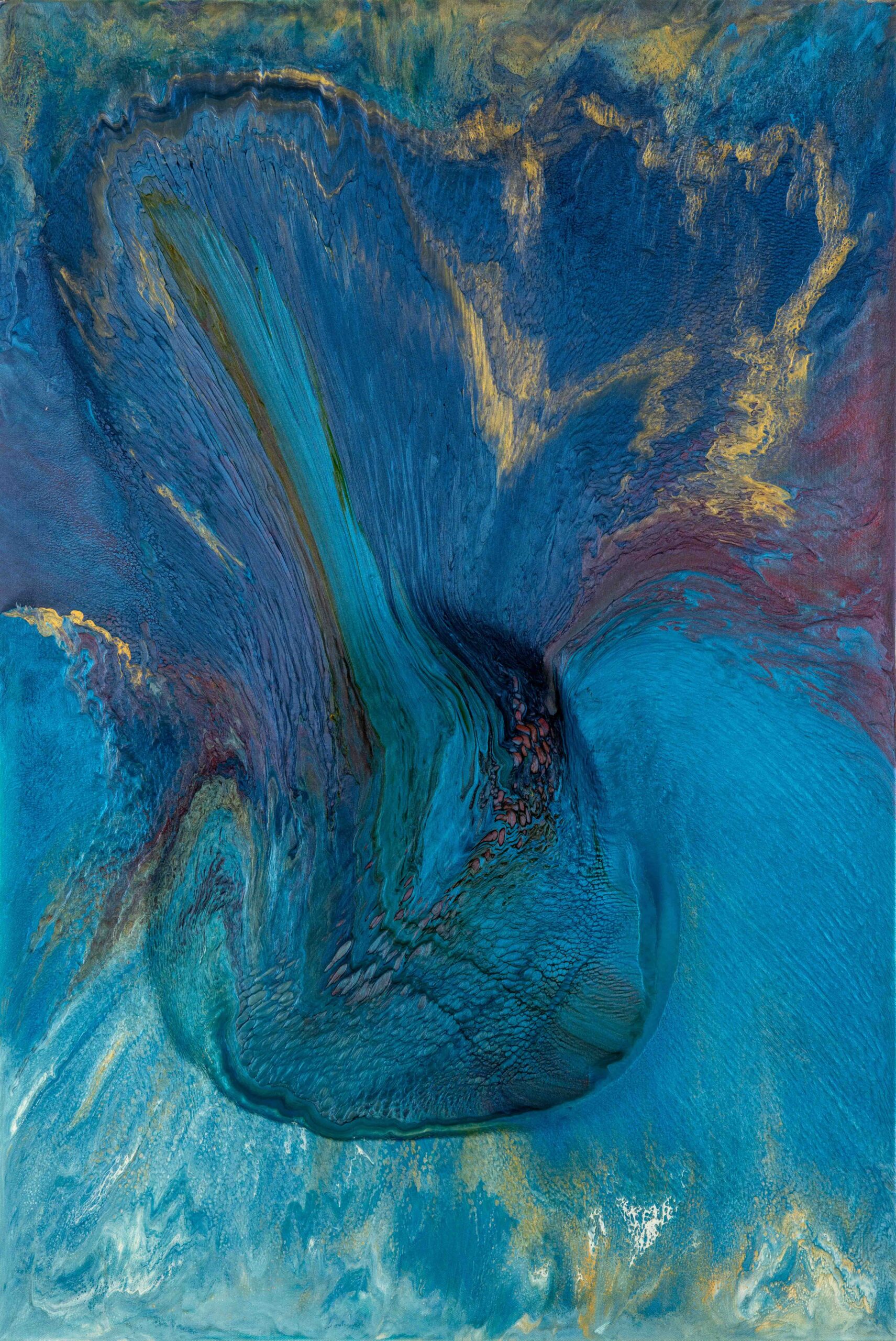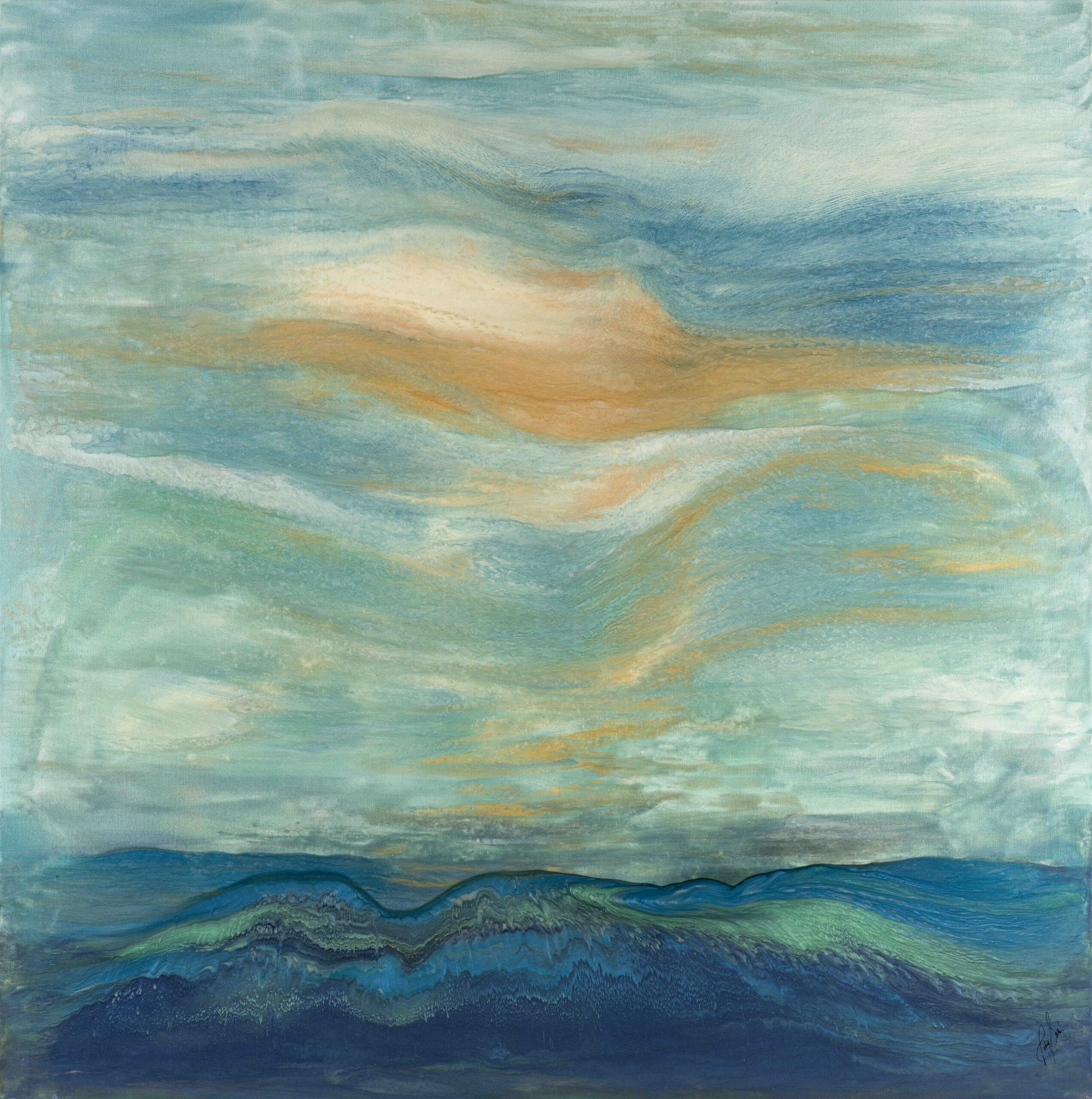 Acrylic/oil/resin pouring. 36"x36". Here are the clouds which there different shapes reflecting the colors of the Sea as the Sun pierce through the clouds